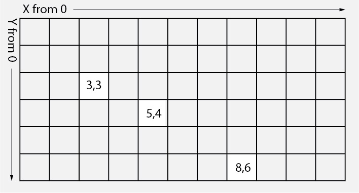 Below are two simple sketches that draw circle in a new position on each frame of the sketch using variables as counters or linearly increasing values. The coordinate system in processing is based on pixels and starts from the top right corner.