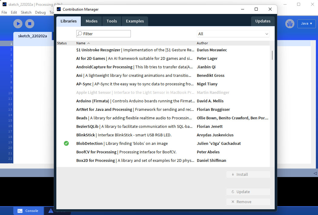We will be using various libraries contributed by the processing community. You can add a library here Sketch>Import Library>Add Library.