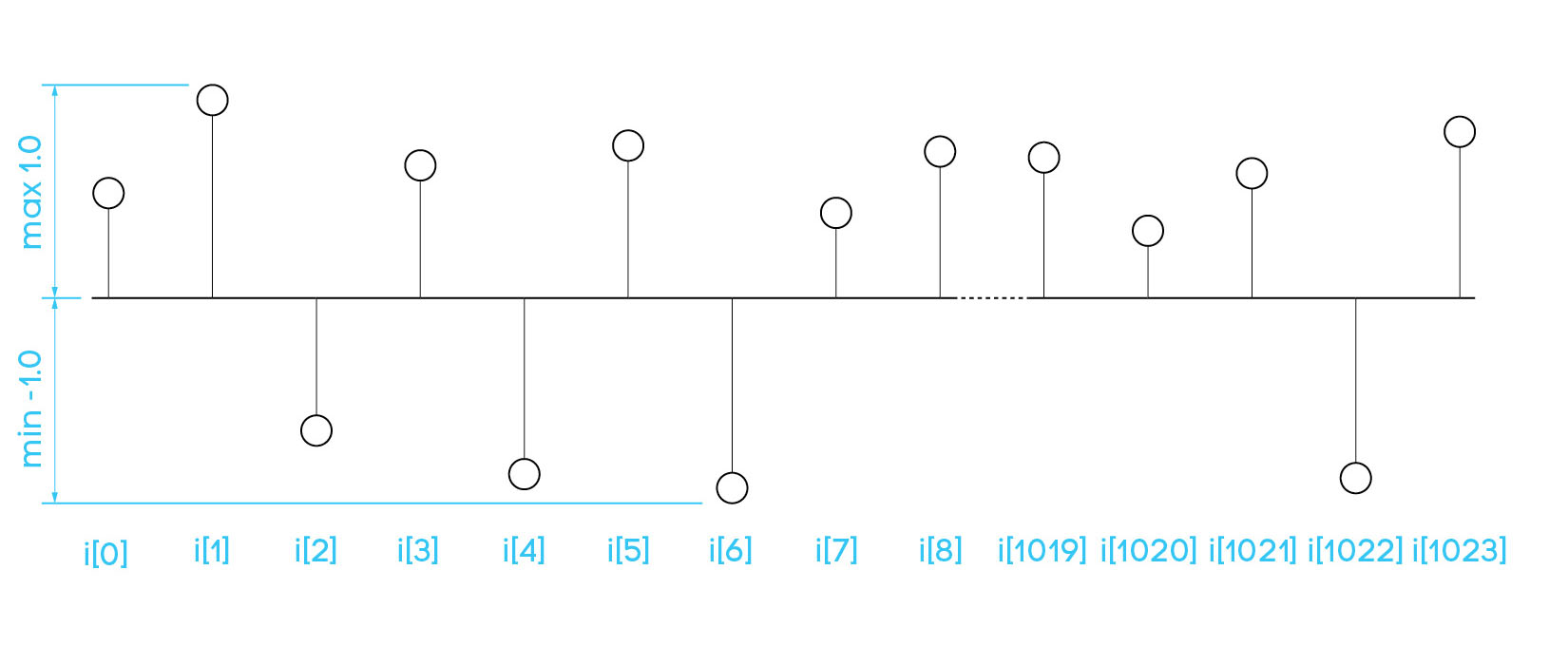 We will be using the AudioInput class from the minim library to receive sound from the computers microphone. We will use a buffer size of 1024, which means each frame the sound will be sampled 1024 times creating 1024 values between -1.0 and 1.0. We can draw a waveform of points by equating each (x,y) value to (index of sample[0-1023],sample value).