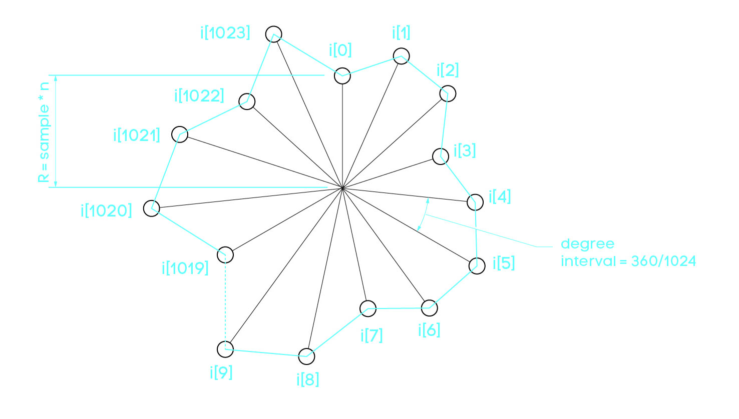 y = (sound sample * multiplier + radius) * sin( angle interval  * loop counter);